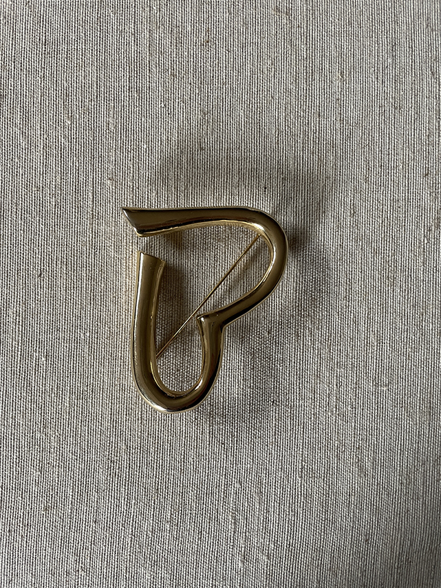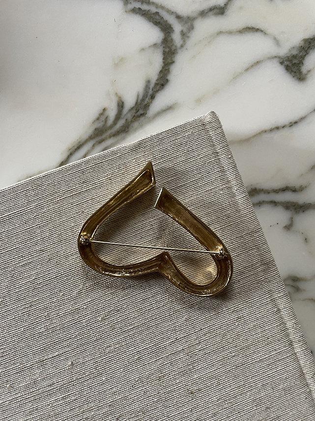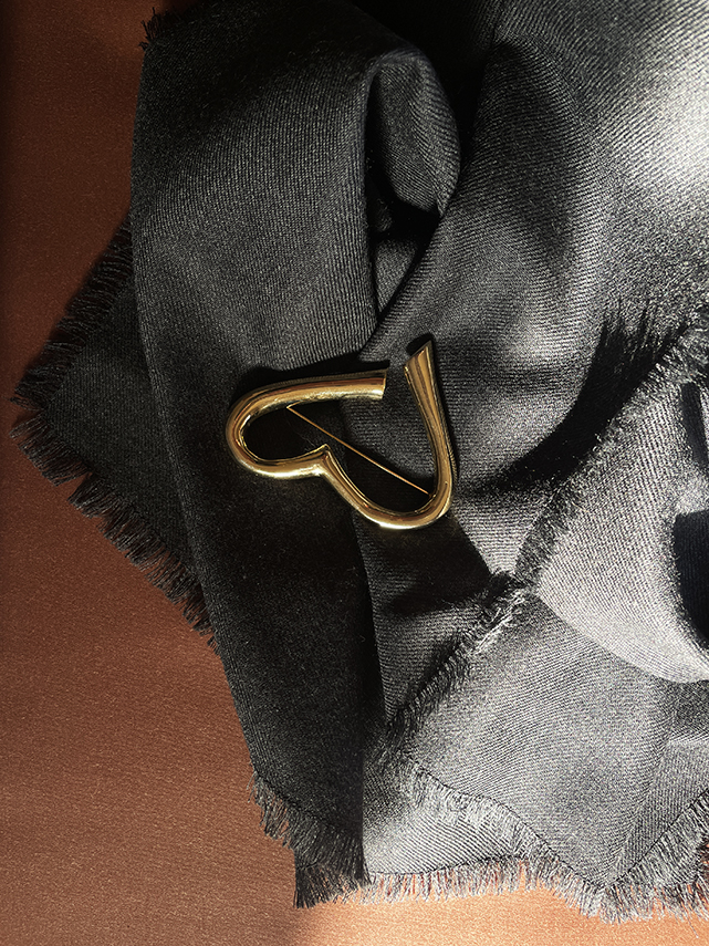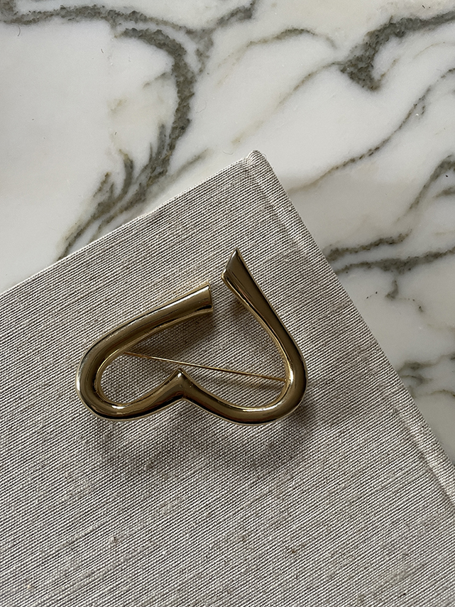 Pins are taking on a new modern way of styling: from pinning up the hem of an oversized sweater, to cinching in the waist of a blazer, or securing a wrap or scarf just right, or pairing it with another pin to add interest to an oversized coat collar. This heavy gold-tone abstract heart (or boobs) brooch has soft edges and detailing.